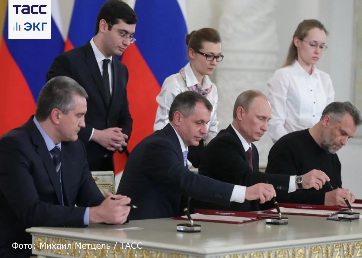 Премьер-министр Крыма Сергей Аксенов, председатель Верховного Совета Крыма Владимир Константинов, президент России Владимир Путин и глава Севастополя Алексей Чалый подписывают межгосударственный договор о принятии региона и города с особым статусом в состав Российской Федерации.