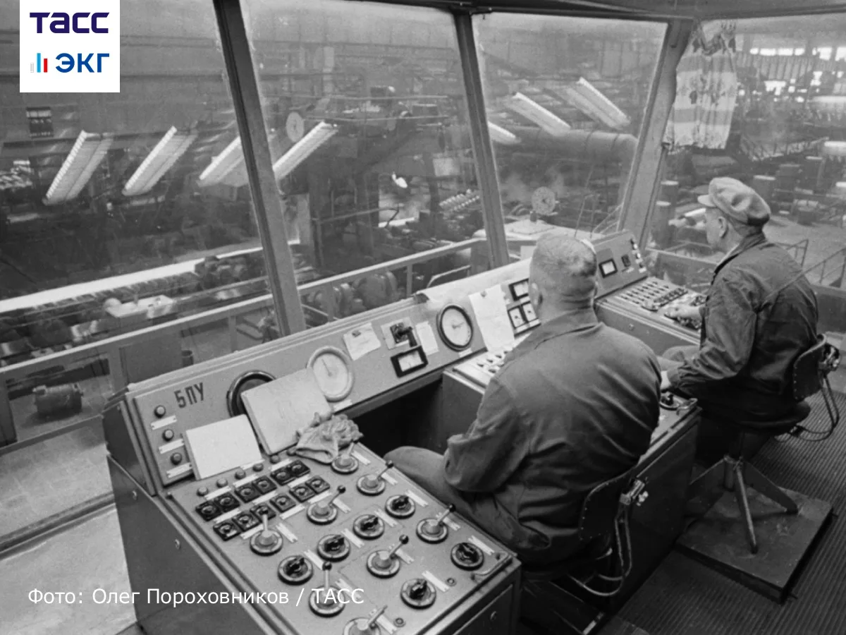Работники завода "Красный выборжец" за пультом управления прокатным станом Дуо-850.