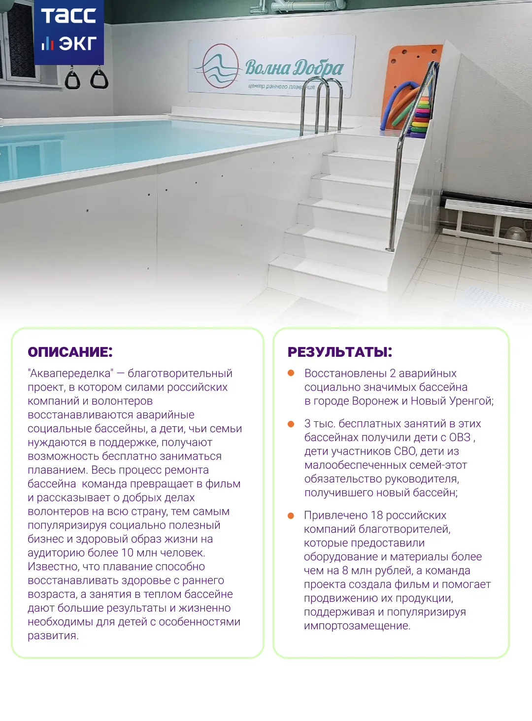 За полтора года реализации проекта, отмеченного экосистемой "Добро.рф", восстановлены уже два бассейна в Воронеже и Новом Уренгое. Возможность бесплатных занятий получили более 3 тыс. детей, а к проекту присоединились 18 российских компаний, предоставивших оборудование и материалы.
