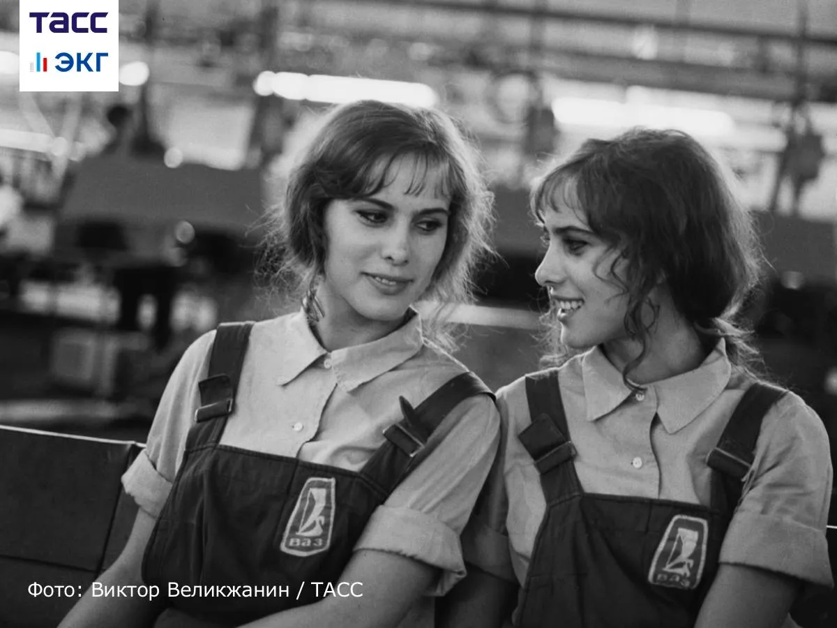 Работницы комсомольско-молодежной бригады сестры-близнецы Алла и Людмила Парфеновы на главном конвейере Волжского автомобильного завода имени 50-летия СССР.