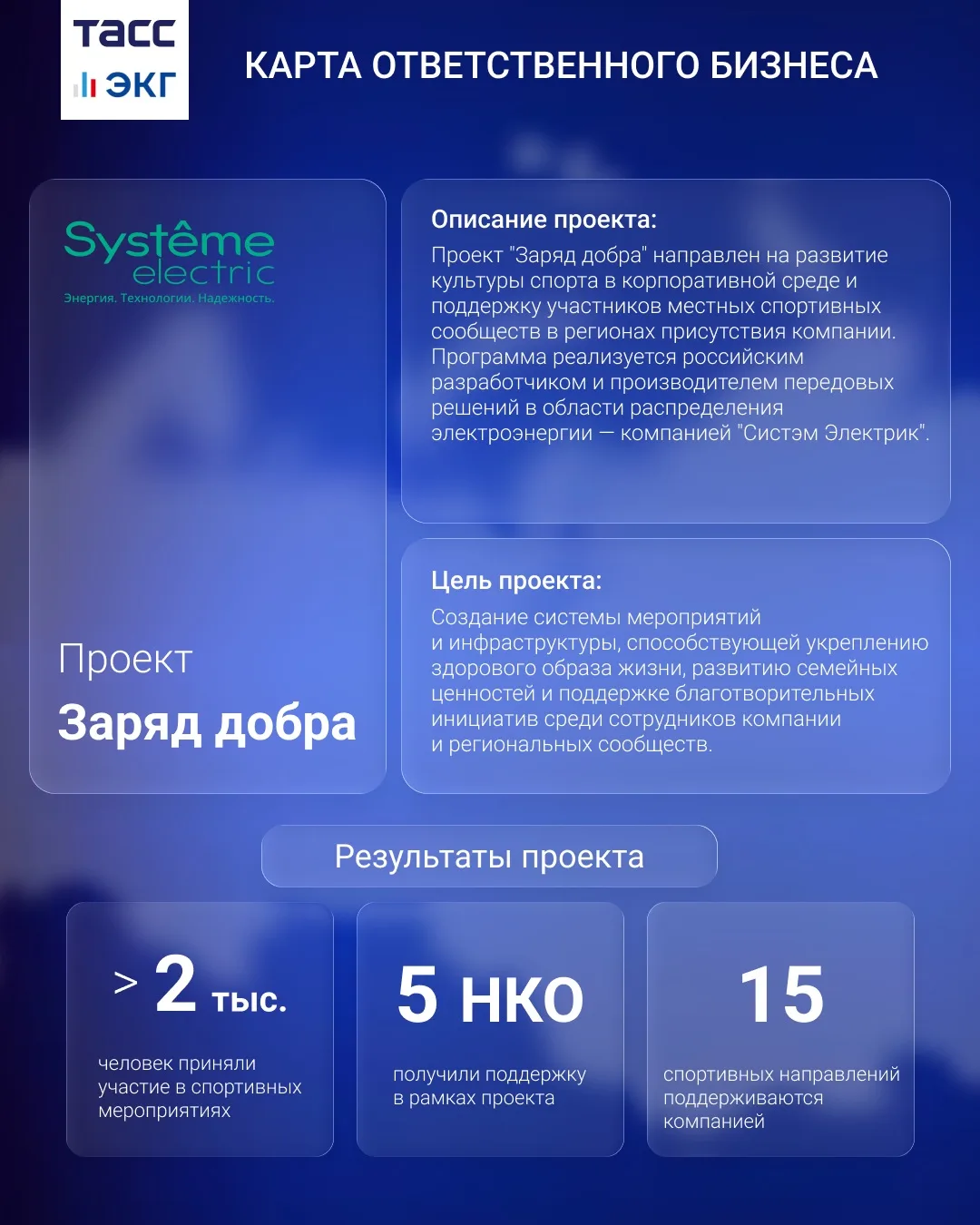 "Как лидеры ЭКГ-рейтинга, мы подтверждаем свою приверженность корпоративной социальной ответственности, создавая возможности для повышения качества жизни сотрудников через занятие спортом, поддерживая детско-юношеский и адаптивный спорт. Проект "Заряд добра" направлен на продвижение здорового образа жизни, семейных ценностей и благотворительных инициатив не только внутри "Систэм Электрик" в различных регионах присутствия компании, но и среди наших партнеров", — поделилась с ТАСС директор по внешним связям "Систэм Электрик" Инга Батманова.