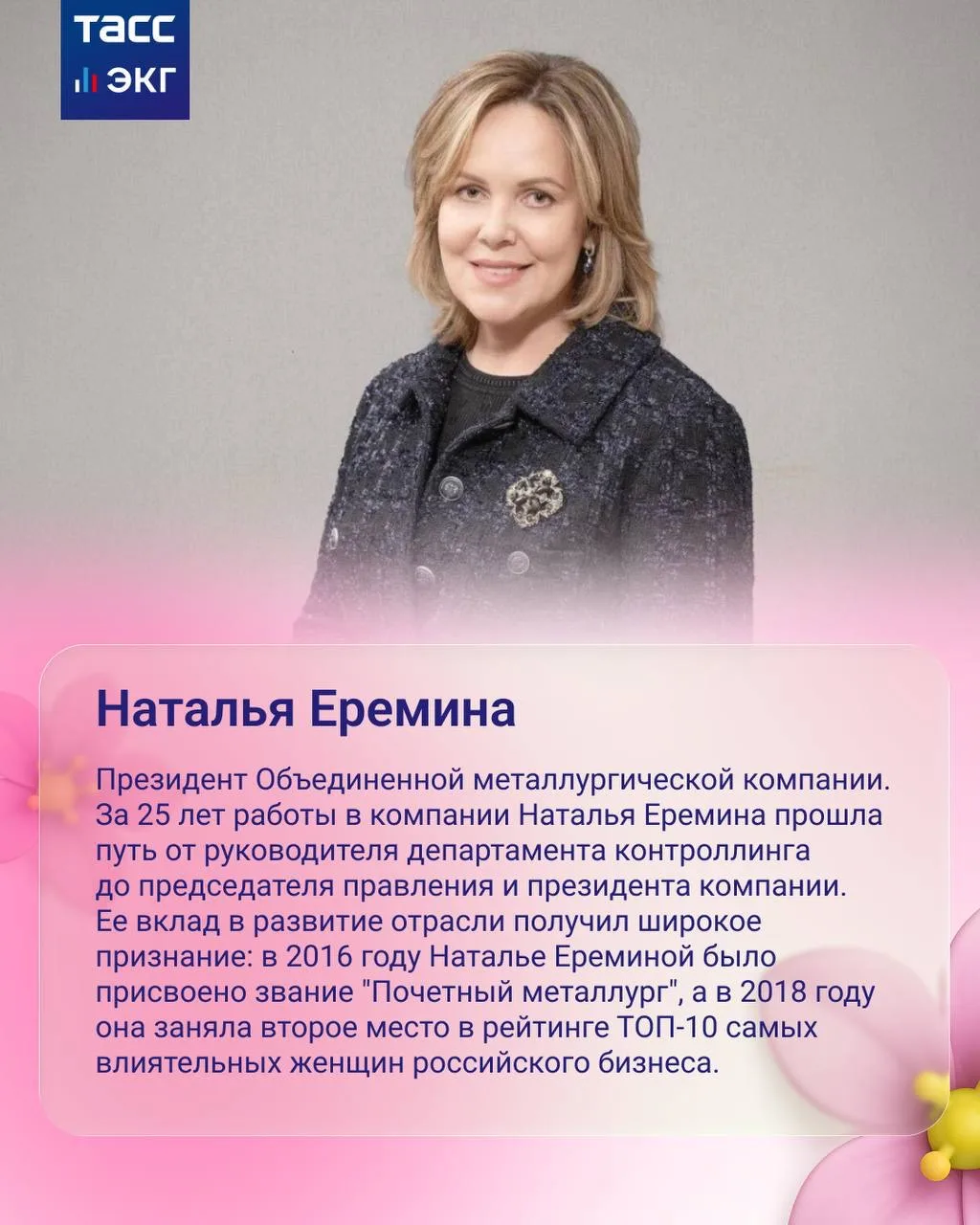 Героиня рубрики — президент Объединенной металлургической компании, участница Совета Евразийского женского форума Наталья Еремина. В компании с 2023 года реализуется проект "Металлургия для женщин. Доступно каждой!", вошедший в "Карту ответственного бизнеса".