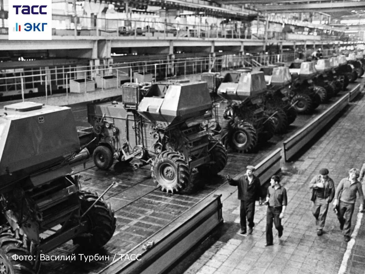 Зерноуборочные комбайны "Нива" на главном конвейере производственного комбайностроительного объединения "Ростсельмаш".