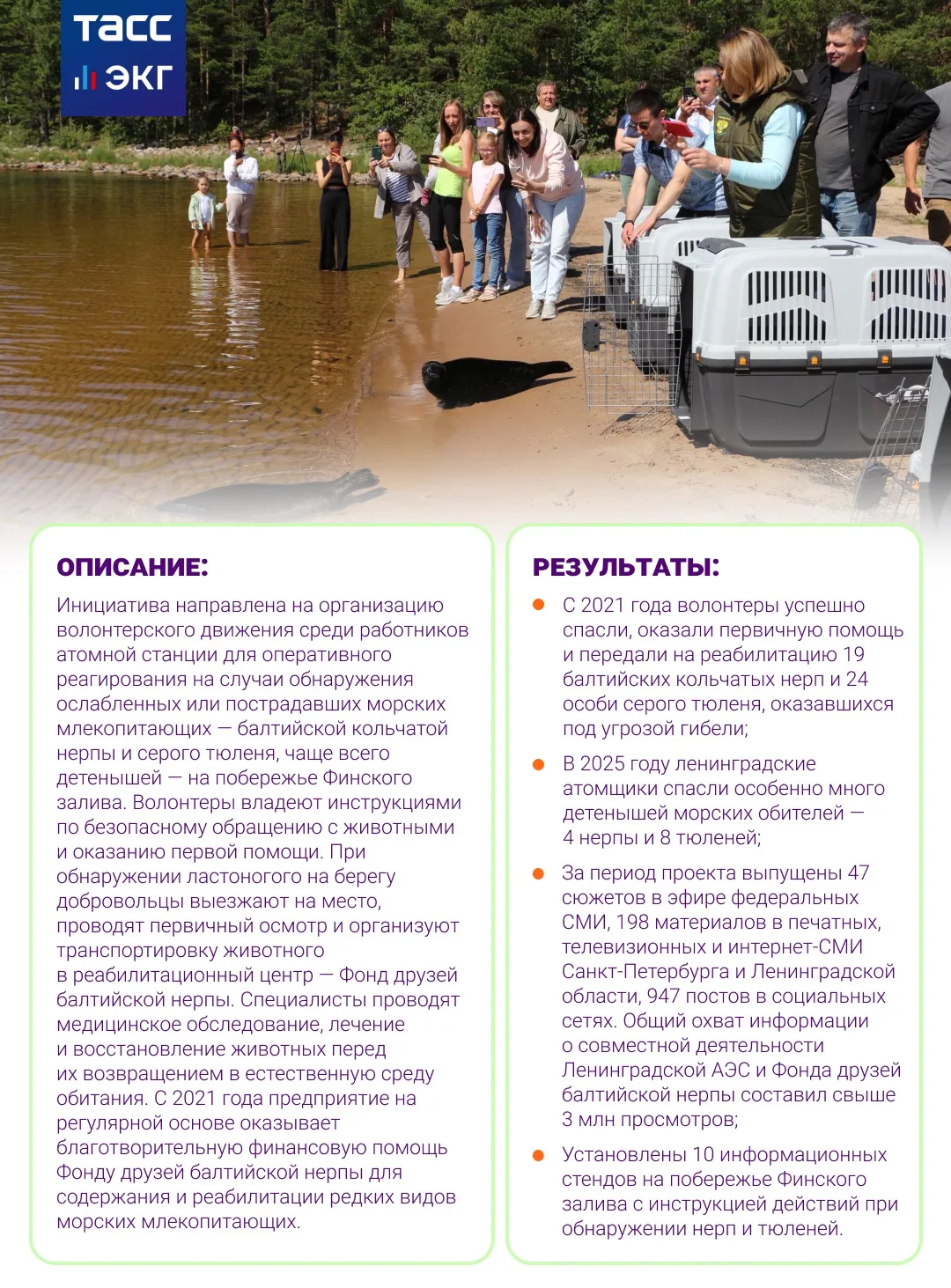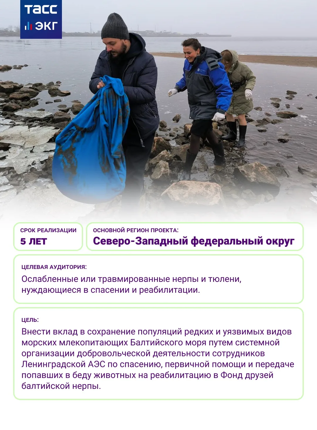 За время реализации проекта, отмеченного экосистемой "Добро.рф", сотрудники Ленинградской АЭС спасли и передали на реабилитацию уже 43 млекопитающих — 19 балтийских кольчатых нерп и 24 серых тюленя. Инициатива объединила около 70 добровольцев, а общий охват информационной кампании на площадках проекта превысил 3 млн просмотров.