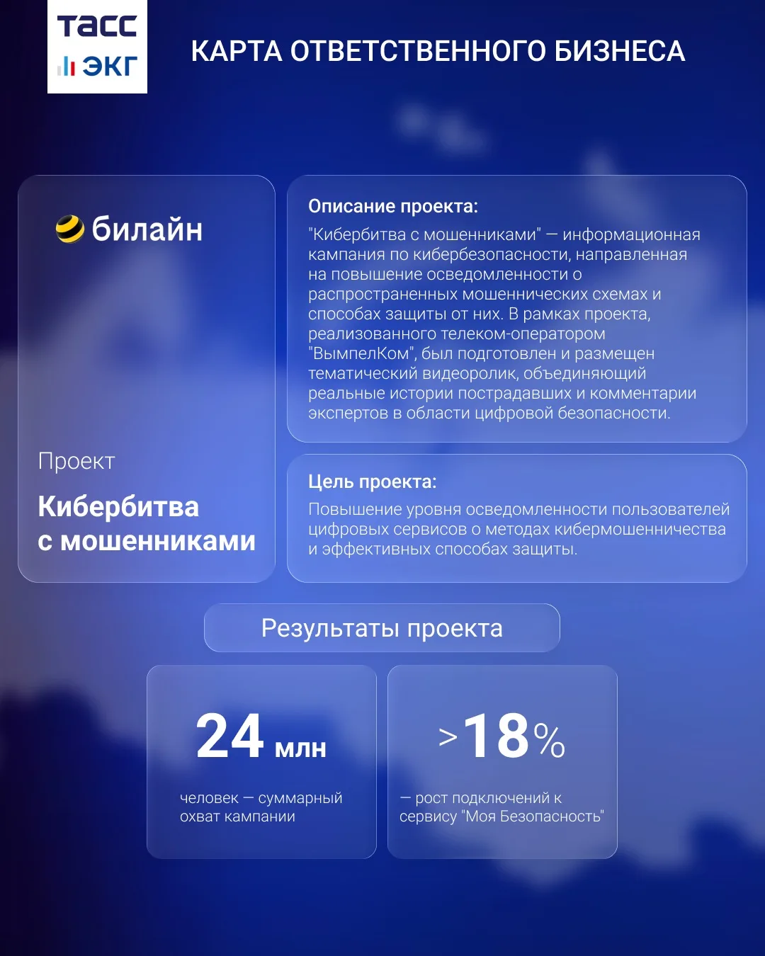 В рубрике — ПАО "ВымпелКом". Один из крупнейших операторов связи, известный под брендом "Билайн", реализует проект "Кибербитва с мошенниками" для повышения осведомленности о мошеннических схемах и способах защиты от них. В рамках инициативы был подготовлен и размещен тематический видеоролик, объединяющий реальные истории пострадавших и комментарии экспертов в области цифровой безопасности.