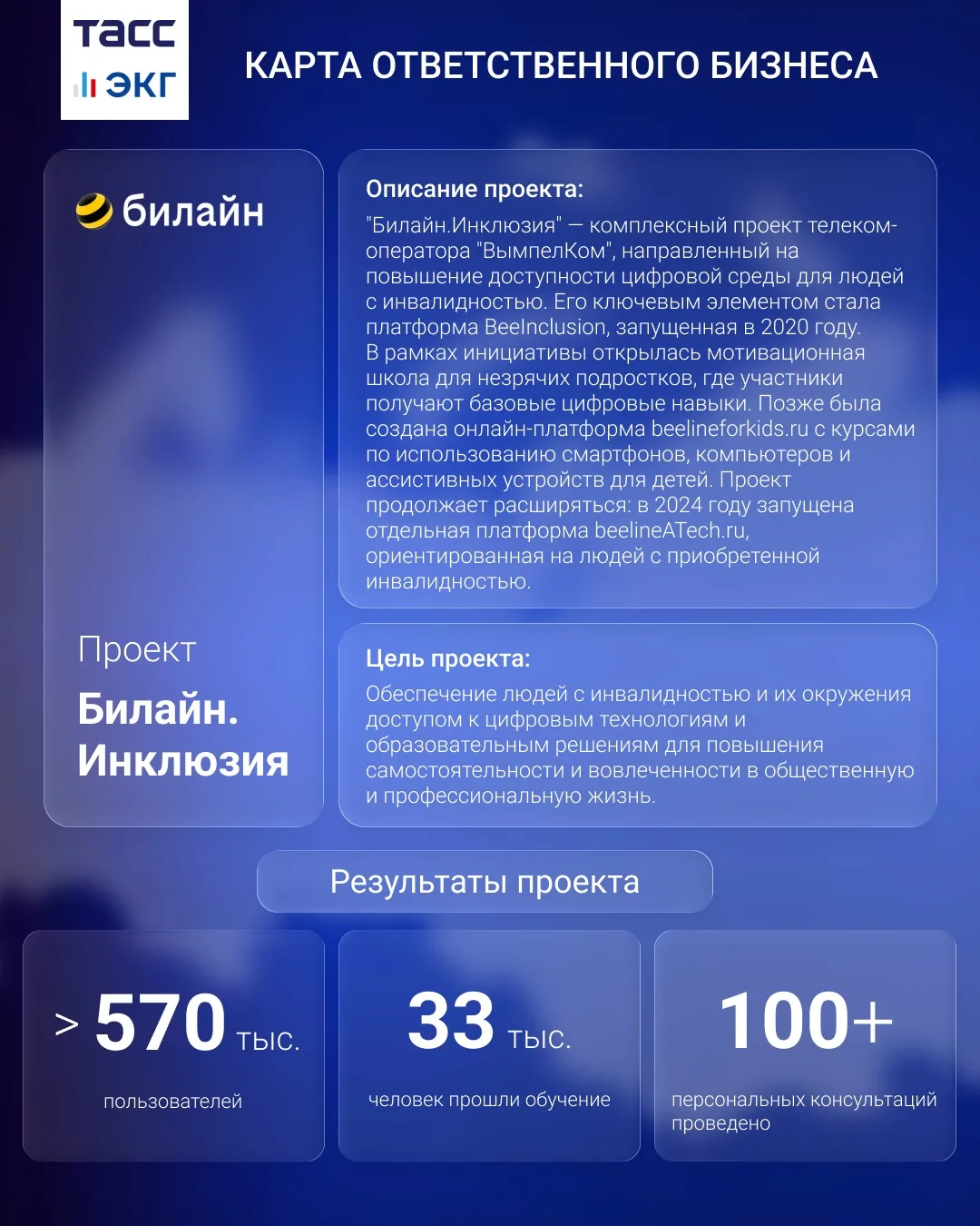 В рубрике — ПАО "ВымпелКом". Телеком-оператор реализует проект "Билайн.Инклюзия", направленный на повышение доступности цифровой среды для людей с инвалидностью. Его ключевым элементом стала платформа BeeInclusion, запущенная в 2020 году.