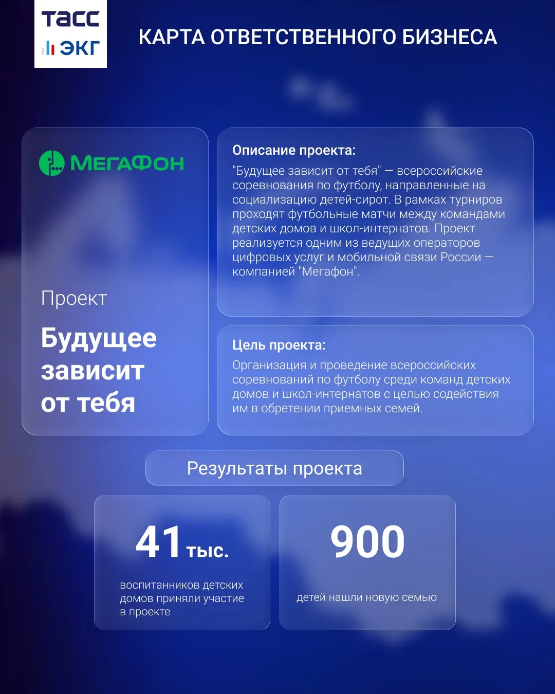В рубрике — ПАО "Мегафон". Один из ведущих операторов цифровых услуг и мобильной связи проводит всероссийские соревнования по футболу "Будущее зависит от тебя" среди команд детских домов и школ-интернатов. Проект направлен на обретение детьми приемных семей.