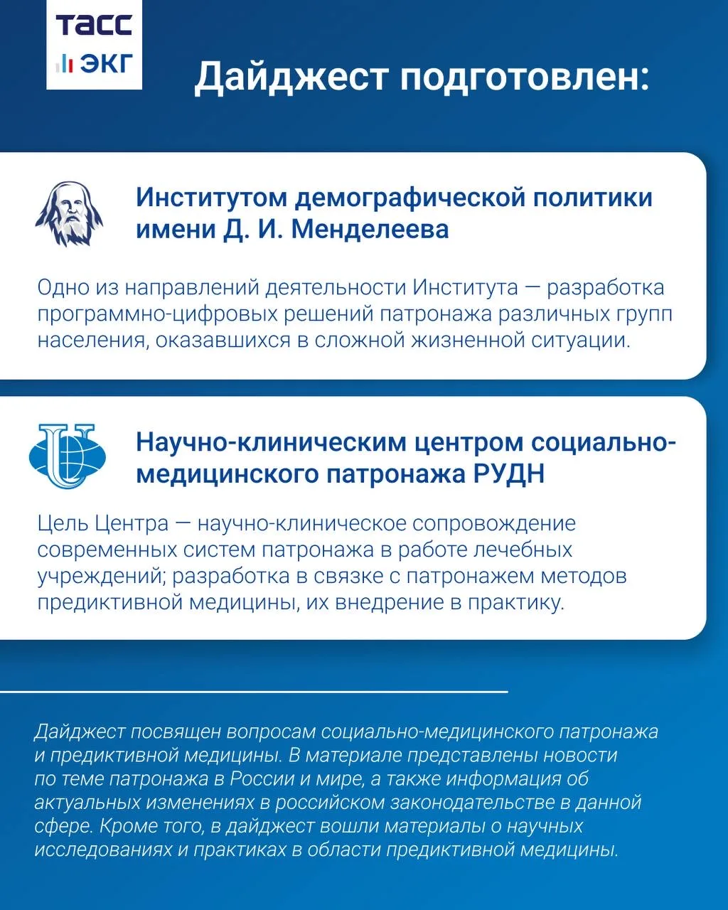 Материал, подготовленный совместно Институтом демографической политики имени Д. И. Менделеева и Научно-клиническим центром социально-медицинского патронажа РУДН имени Патриса Лумумбы, посвящен развитию систем патронажа, предиктивной медицины и цифрового мониторинга здоровья в России и мире.