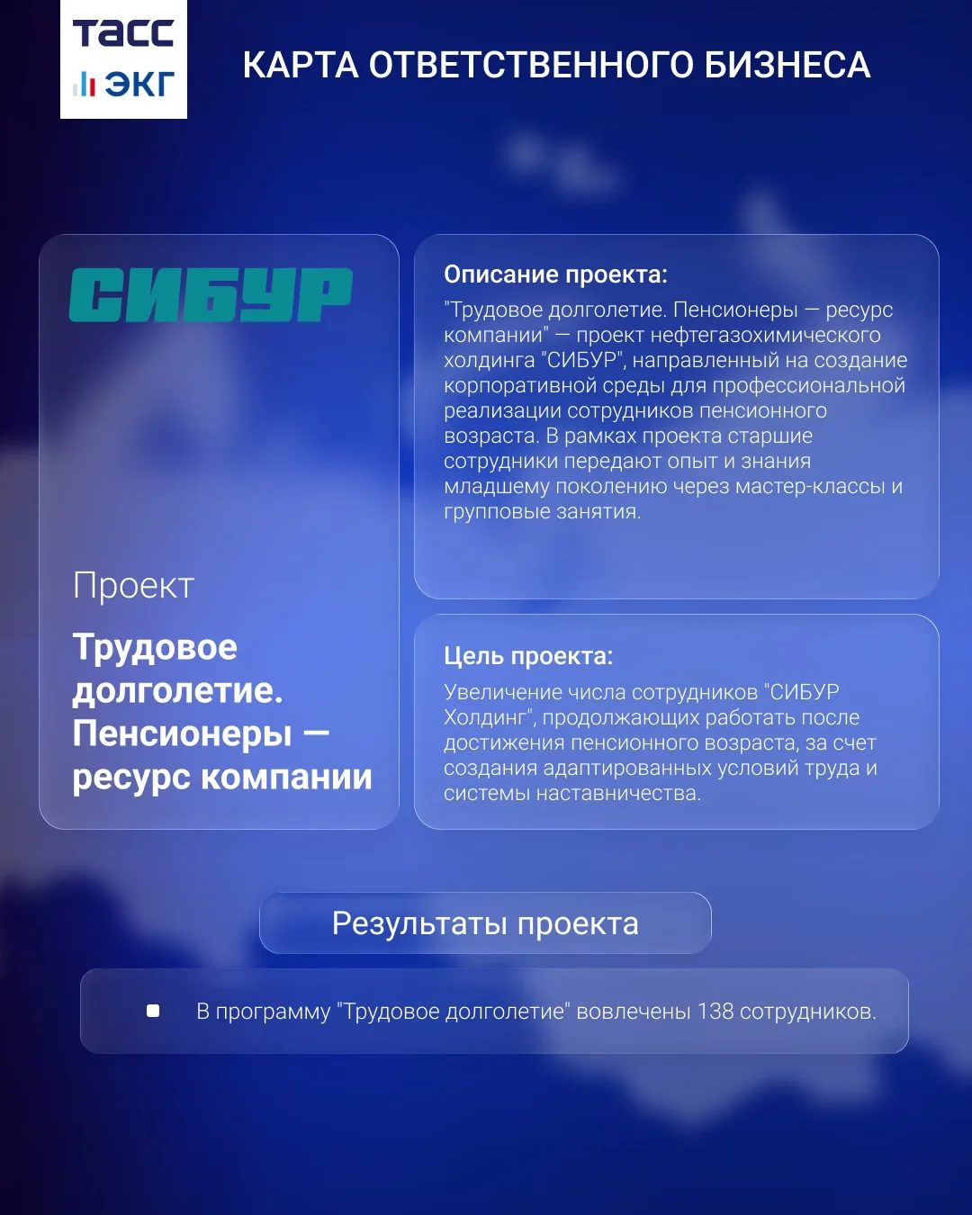 В рубрике — ПАО "СИБУР Холдинг". Нефтегазохимическое предприятие реализует проект "Трудовое долголетие. Пенсионеры — ресурс компании", направленный на создание корпоративной среды для профессиональной реализации сотрудников пенсионного возраста. В рамках проекта старшие сотрудники передают опыт и знания младшему поколению через мастер-классы и групповые занятия.