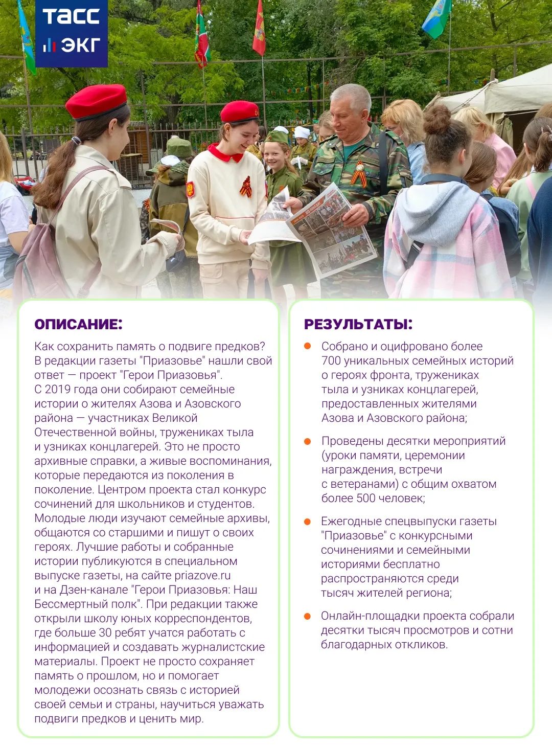 За время существования конкурса, отмеченного экосистемой "Добро.рф", редакции удалось собрать и оцифровать свыше 700 семейных историй. Онлайн-площадки "Герои Приазовья" набрали десятки тысяч просмотров. Кроме того, редакция бесплатно предоставляет ежегодные спецвыпуски газеты жителям региона.