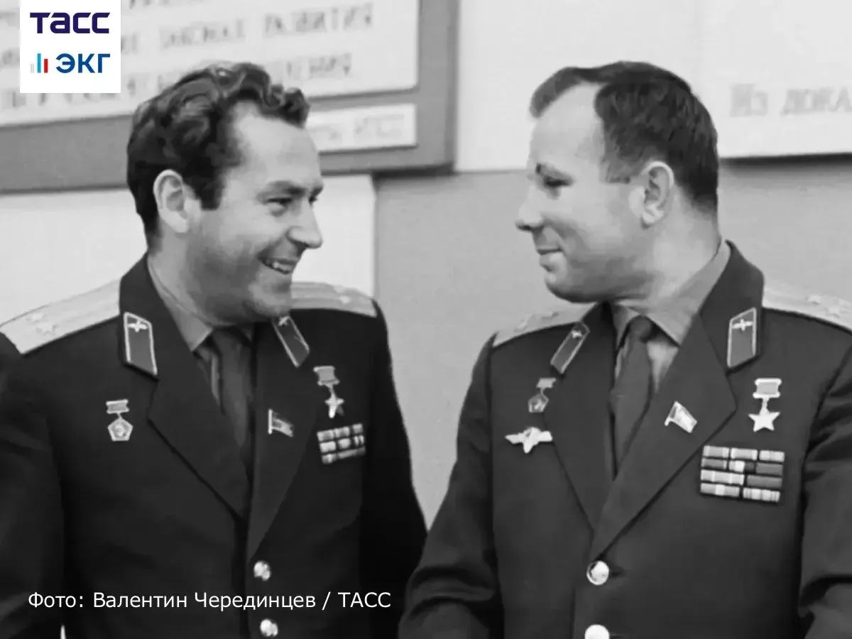 Второй в мире человек, совершивший орбитальный космический полет, Герман Титов и заместитель начальника Центра подготовки космонавтов, командир отряда советских космонавтов, первый в мире человек, совершивший полет в космос, Юрий Гагарин на занятиях в Военно-воздушной инженерной академии имени Н. Е. Жуковского.