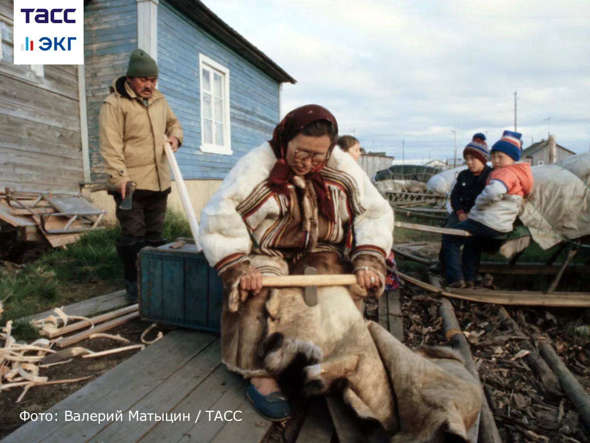Глава семьи Иван Выучейский изготавливает нарты (традиционные длинные узкие сани для езды на оленях/собаках), а его супруга Алексаднра шьет меховую одежду.