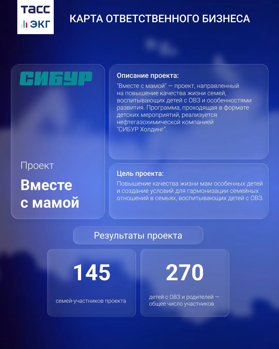 В рубрике — ПАО "СИБУР Холдинг". Компания реализует проект "Вместе с мамой", направленный на повышение качества жизни семей, воспитывающих детей с ОВЗ и особенностями развития. Программа проходит в формате детских мероприятий: мастер-классов, а также экскурсий на производства.