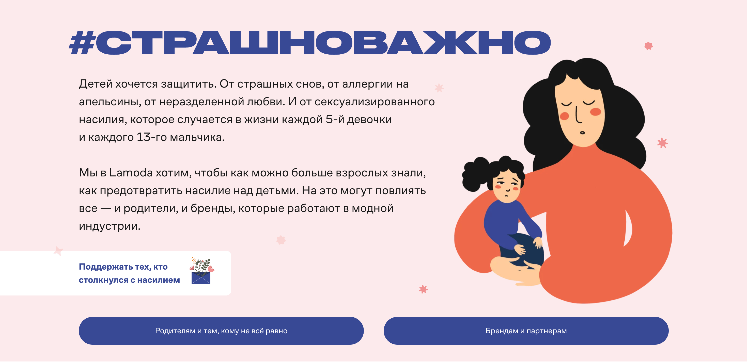 По данным Lamoda, сексуализированное насилие – реальность для каждой пятой девочки и каждого тринадцатого мальчика. Дети не сообщают о произошедшем из‑за чувства стыда, страха и вины. Взрослые могут не распознавать признаки травмы или избегать обсуждения вопросов личной безопасности с ребёнком.