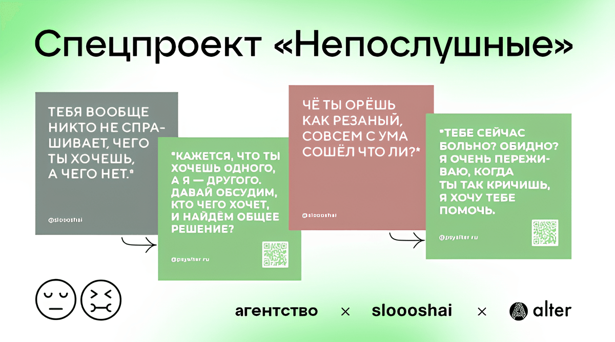 В День матери на фасадах зданий в Москве были размещены парные стикеры: первый содержал типичную негативную фразу родителя, второй – её конструктивный аналог от психологов с QR-кодом, ведущим на лендинг проекта.