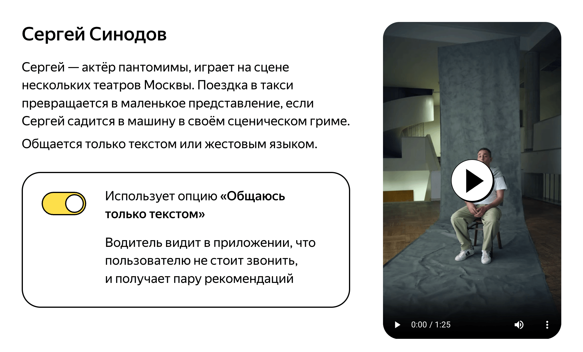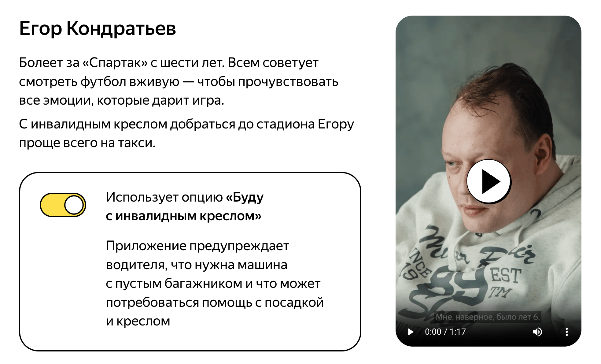 Проект направлен на создание доступной и инклюзивной городской мобильности. В коммуникационной кампании приняли участие реальные пользователи с ограниченными возможностями. Они рассказали о своём опыте взаимодействия с сервисом. Это позволило выстроить доверительную и практико-ориентированную коммуникацию.