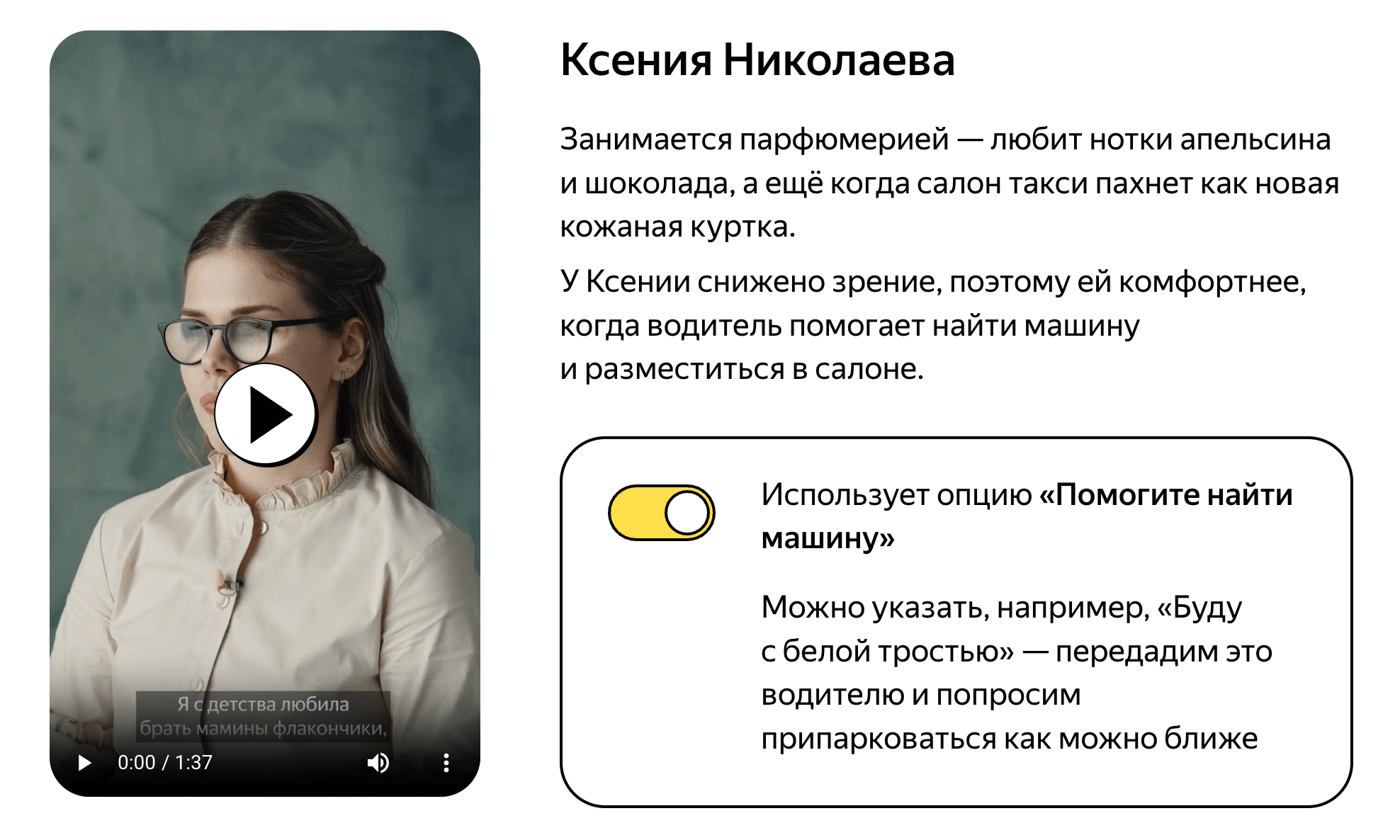 В приложении внедрён раздел «Специальные возможности». Пользователи могут указать, что будут с инвалидным креслом, общаются только текстом, будут с собакой-поводырём или нуждаются в помощи при поиске автомобиля. Для водителей создан обучающий раздел с рекомендациями по взаимодействию с пассажирами с особыми потребностями.